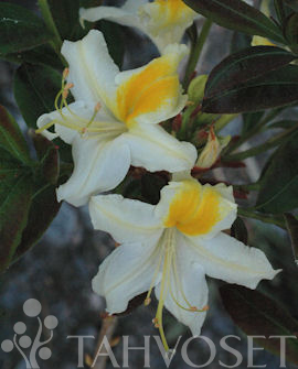 Pensas kukkii valkoisin, tuoksuvin kukin kesäkuun keskivaiheilla. Kukkien yläterälehden peittää tummankeltainen laikku. Syysväri tummanpunainen. Alkuperä Helsingin yliopisto. Rhododendron ’Bouquet de Flore’ x (Mustilan arboretumin keltakukkainen atsalea) TTA-615. FinE. Korkeus 1-1,5m.