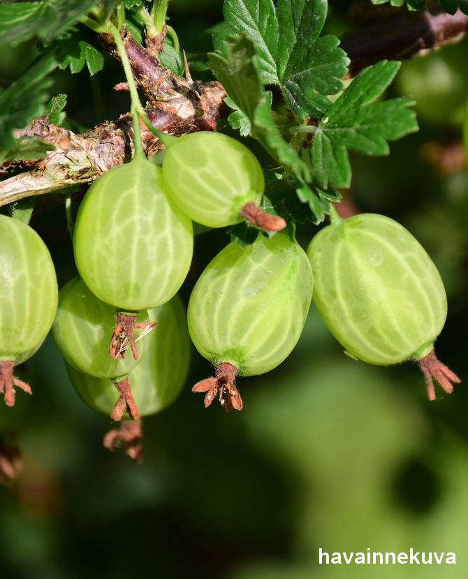 Suuret vihreänkeltaiset ja maukkaat marjat. Satoisa lajike. Vartettu, runko 80 cm.