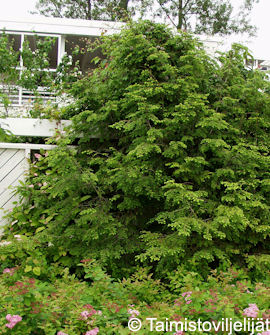 Matala- ja tiiviskasvuinen havupensas. Leveänpyöreä pesämäinen kasvutapa, versot nuokkuvat latvoistaan. Korkeus 50-100 cm, leveys 80 cm. Puolivarjo-varjo, kosteahko maa.