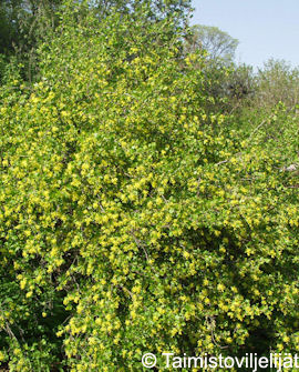 Aluksi pystykasvuinen, vanhempana kaarevaoksainen. Lehdet vaaleanvihreät, syvään 3-liuskaiset. Hyväntuoksuinen, kullankeltainen runsas kukinta aurinkoisella ja avoimella paikalla. Mustat marjat syötäviä, mutta melko mauttomia. Tekee juurivesoja. Vaatii säännöllistä leikkausta.