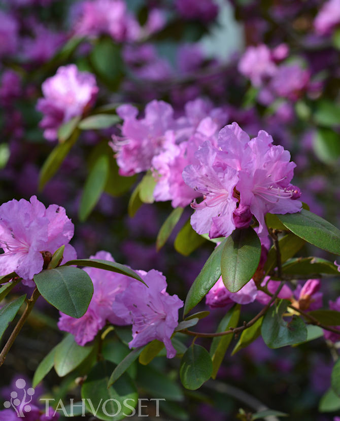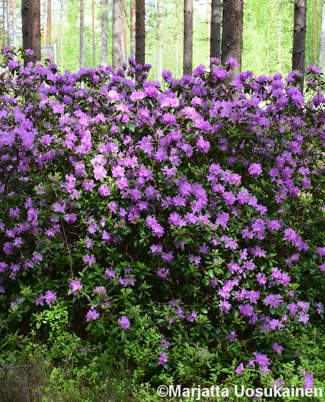 Kukkii ensimmäisten alppiruusujen joukossa aikaisin keväällä (selvästi toukokuun puolella) violetein kukin. Tuoksuvien lehtien syysväri punainen tai keltainen. Talvehtivat lehdet hyvin tummat punertavanvihreät. Suojattava kevätauringolta. Korkeus noin 1,5-2,5 m. TTA-304.