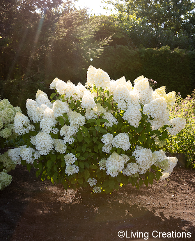 Keskikokoisen syyshortensian kukinnot pysyvät koko kauden valkoisina. Valkoisen sävy elää hieman kukinnan edetessä. Korkeus ja leveys noin 1 m. Huomioitu hopeisella KVBC-Awards -palkinnolla. Living Creations® hortensia.