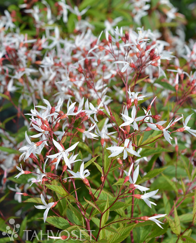 Pienet puna-valkoiset kukat harvassa, mutta runsaskukkaisessa latvatertussa. Kukkii kesä-heinäkuussa. Korkeus 60-90 cm. Kolmiliuskaiset lehdet saavat viinin- tai oranssinpunaisen syysvärin. Ei pidä siirtämisestä. Helppohoitoinen.