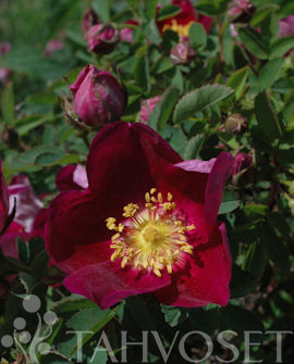 Tiheäkasvuinen, juhannusruusua sirompi kasvutapa. Tumman sametinpunaiset, yksinkertaiset kukat n. 3-4 cm levyiset. Kukinta on runsas. Omajuurinen. Tarhapimpinellaruusu, Pimpinellifolia-Ryhmä.