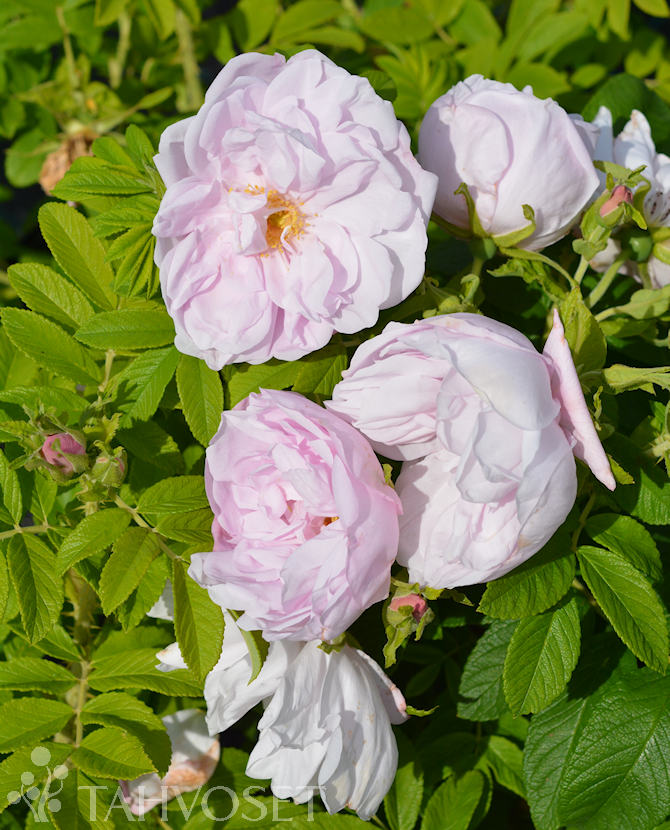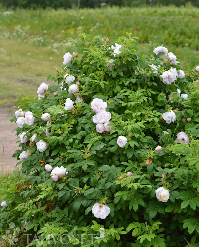 Rugosa tyyppinen matalakasvuinen pensasruusu. Kukkii syvänpunertavan valkoisin, puolikerrannaisin kukin syksyyn saakka. Runsaasti oranssinpunaisia kiulukoita. Sietää kuivuutta. Omajuurinen.
