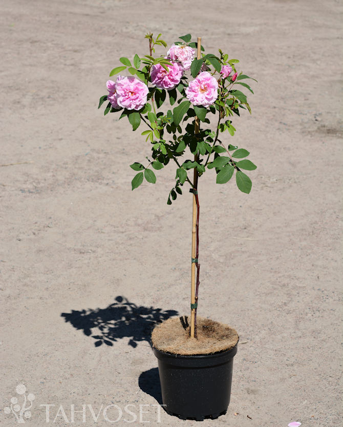 Tiheäkasvuinen, hento-oksainen, vähäpiikkinen. Vaaleanpunaiset kukat kerrotut, leveät, litteät, epäsäännöllisen muotoiset, suuret. Kukkii runsaasti. Lehdet vaaleanvihreät. Uudet versot voimakkaan punaiset. Tekee niukasti juuriversoja.